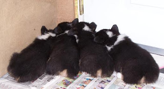One time a lady came over to look at the puppies, she fell in love with the breed long ago, and always wanted one. She had apparently told her husband about her desire to have one, and when she was here her husband was walking around the yard looking as uninterested as one can be, he confessed that he wasn't thrilled about the prospect of getting a Corgi. He told me that his buddies at work were giving him the business because his wife wanted a corgi. They told him that he would end up with a dog that would get high centered in the woods. I thought that was pretty funny because I might have thought the same thing once, just looking at the short legged little guys. I called Fuey, our wonder boy, and threw the red Kong, bouncing it on the driveway and over the 4 ft rock wall, Fuey bounded right over the wall after it. He returned like he always does with the Kong, dropped it and I threw it again, this time over the firewood pile. Fuey jumped onto the wood pile and scrambled over the top and returned with the Kong. That man threw the Kong for Fuey for about a half an hour, each time trying to get it into a place where he thought Fuey couldn't get to it, only to have it dropped right back at his feet. The puppy that the man picked out looked just like Fuey, it was no longer his wife's deal, it became his dog, and in the weeks before the puppy was old enough to go home he visited him many times, sometimes with the wife and once with his teenage boy, and several times just by himself.